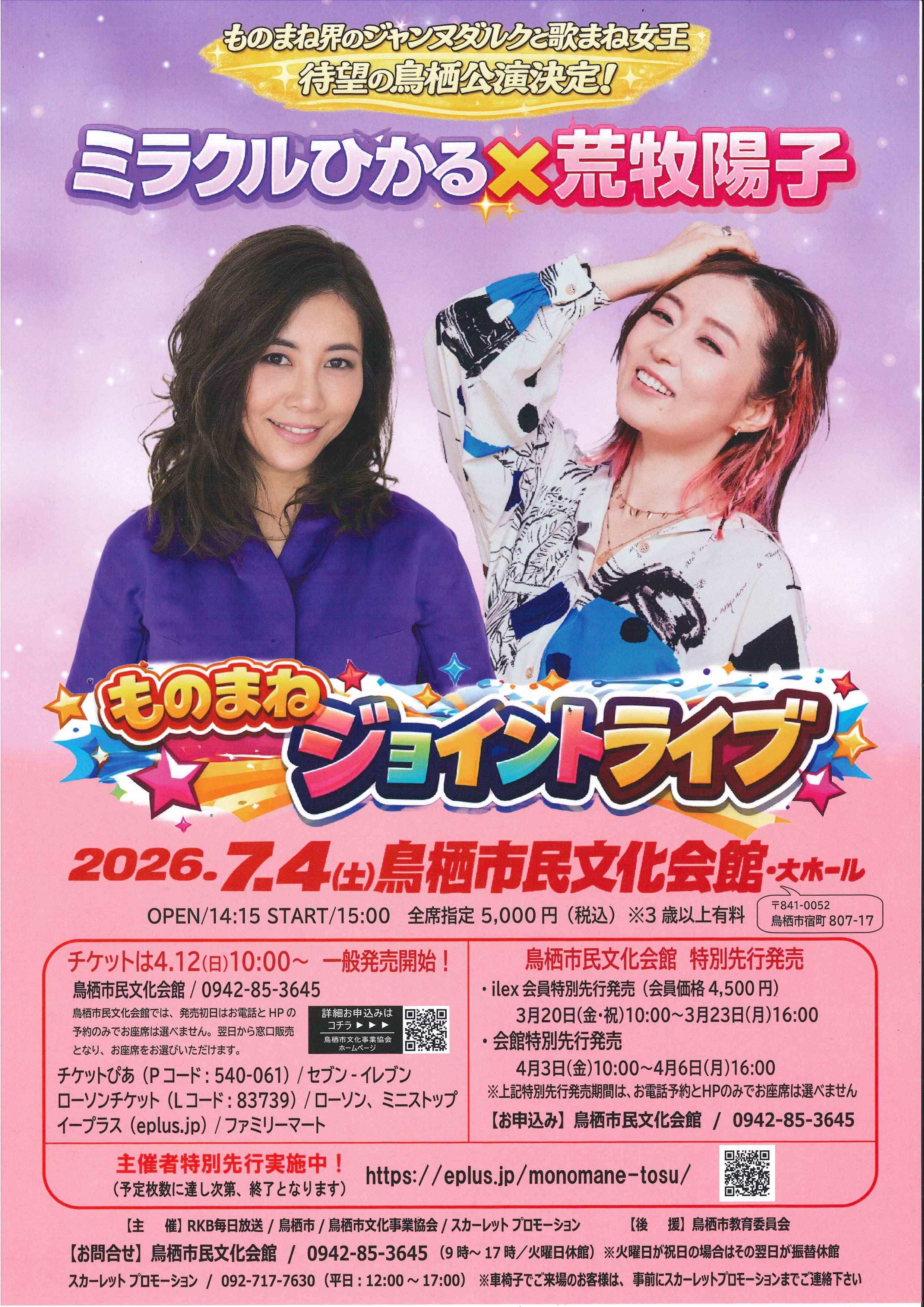 | 発売日 | ilex会員先行発売:2026年3月20日(金・祝)10時~3月23日(月)16時 会員のみ/電話・HPにて受付 会館特別先行発売:2026年4月3日(金)10時~4月6日(月)16時 電話・HPにて受付 一般発売:2026年4月12日(日)10時~ ※鳥栖市民文化会館での一般発売初日4/12(日) 電話・HPにて受付 ※一般発売翌日4/13(月)より電話・窓口販売にてお席を選べます。 但し、一般発売初日で予定枚数に達した場合は販売はございません。 |